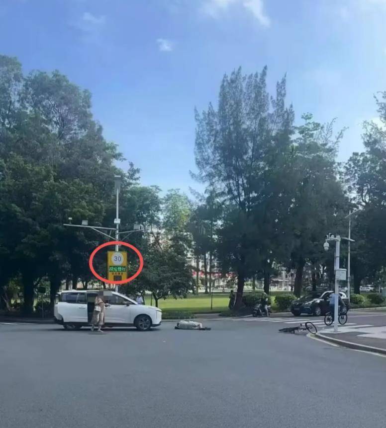 9月29日,广东广州,华南理工大学(五山校区)校园内发生一起交通事故,现场照片显示,一辆白色机动车撞上骑自行车的人,被撞人员倒在车前,倒地自行车相距数米远,车旁可见限速30公里/小时的交通指示牌,牌上还写有“减速慢行”四个大字。(据9月29日正在新闻报道)