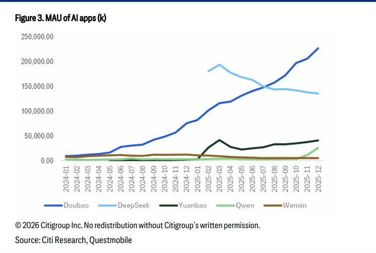 从投流回报率来看,豆包全年投流金额仅4亿元,却长期排在各大应用榜第一,据华尔街见闻报道,花旗最新研报显示,截至2025年12月,豆包月活用户数(MAU)达2.27亿,日活跃用户数(DAU)已达7000万,部分AI助手人均使用时长已超过100分钟。