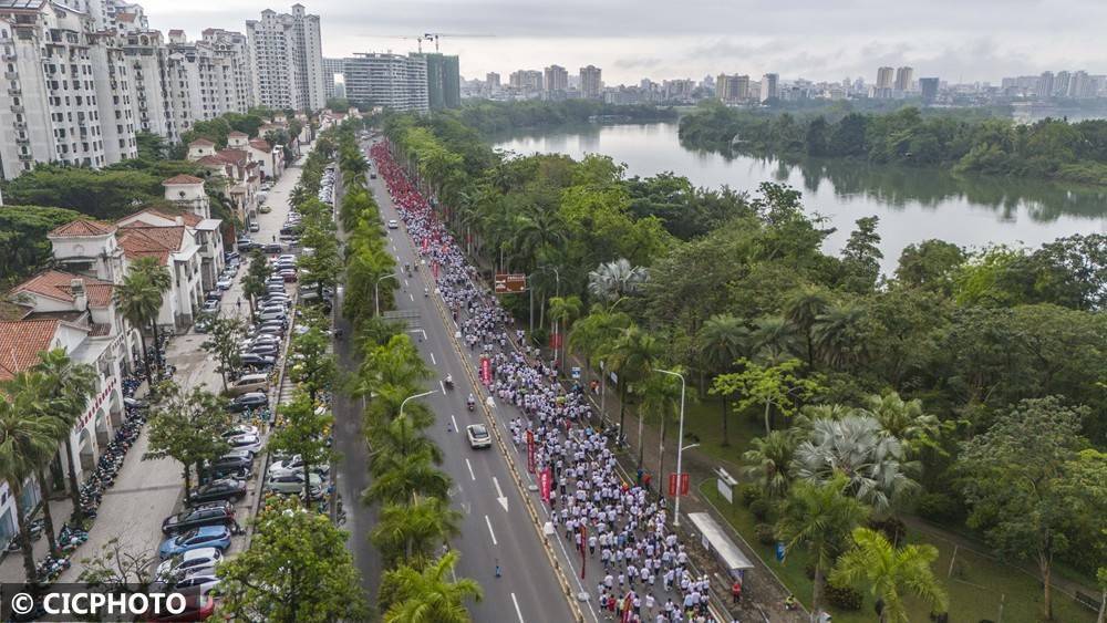 ↑2025年5月2日,人们在海南省琼海市万泉河畔参加徒步活动。(无人机照片)CICPHOTO/蒙钟德 摄