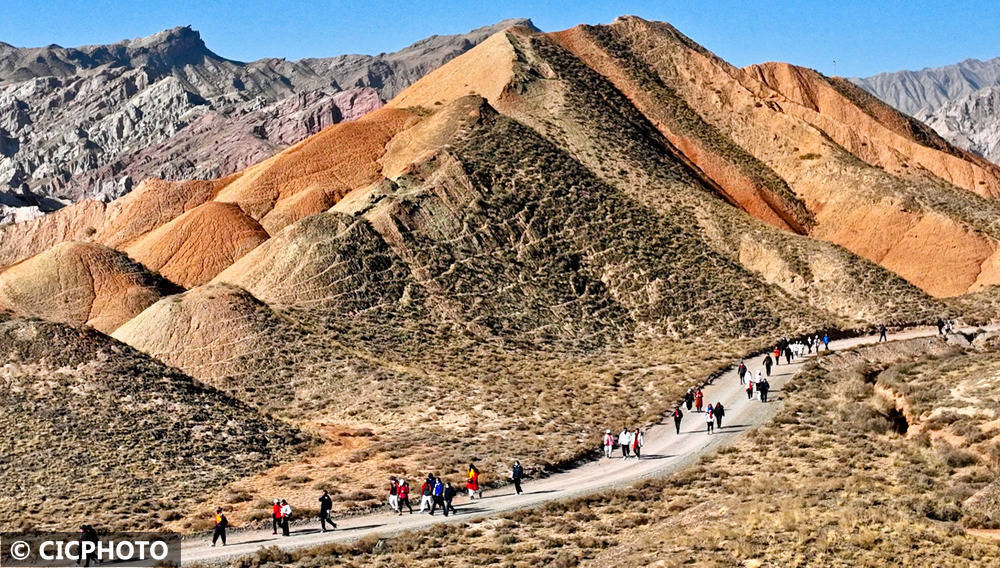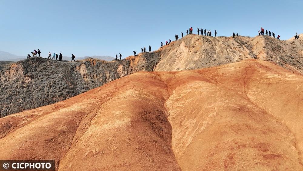 ↑2025年4月4日,在甘肃省张掖市参加徒步活动的健身爱好者途经七彩丹霞景区外围彩色丘陵。(无人机照片)CICPHOTO/成林 摄