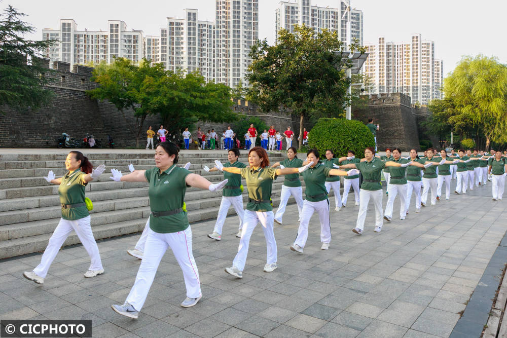 ↑2023年8月8日,健身爱好者在山东省滕州市龙泉广场健步走。CICPHOTO/李立 摄
