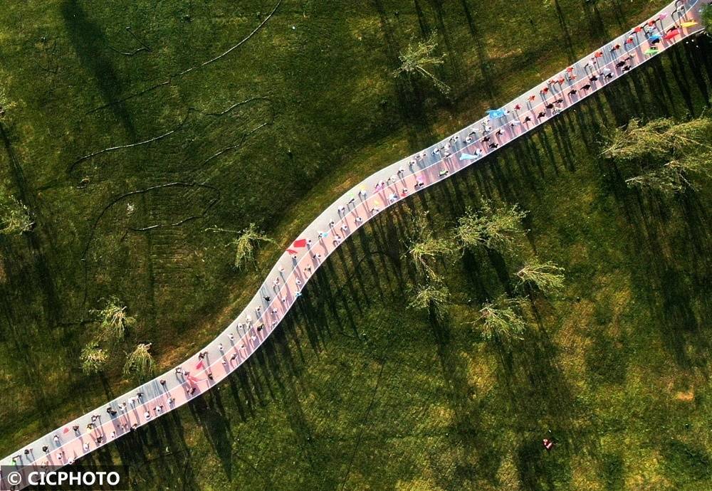 ↑2025年5月11日,人们在安徽省芜湖市弋江区十里江湾人民公园参加健步走活动。(无人机照片)CICPHOTO/王玉实 摄