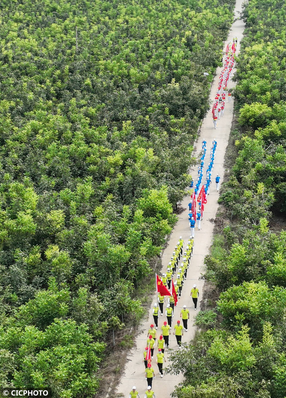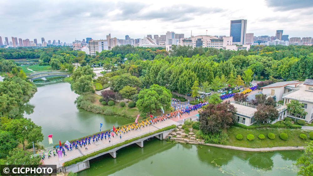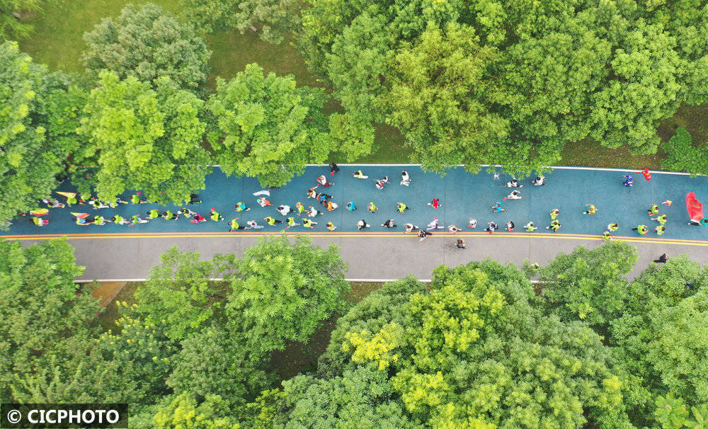 ↑2024年6月15日,人们在河北省石家庄市栾城区劳动公园参加健步走活动。(无人机照片)CICPHOTO/李明发 摄