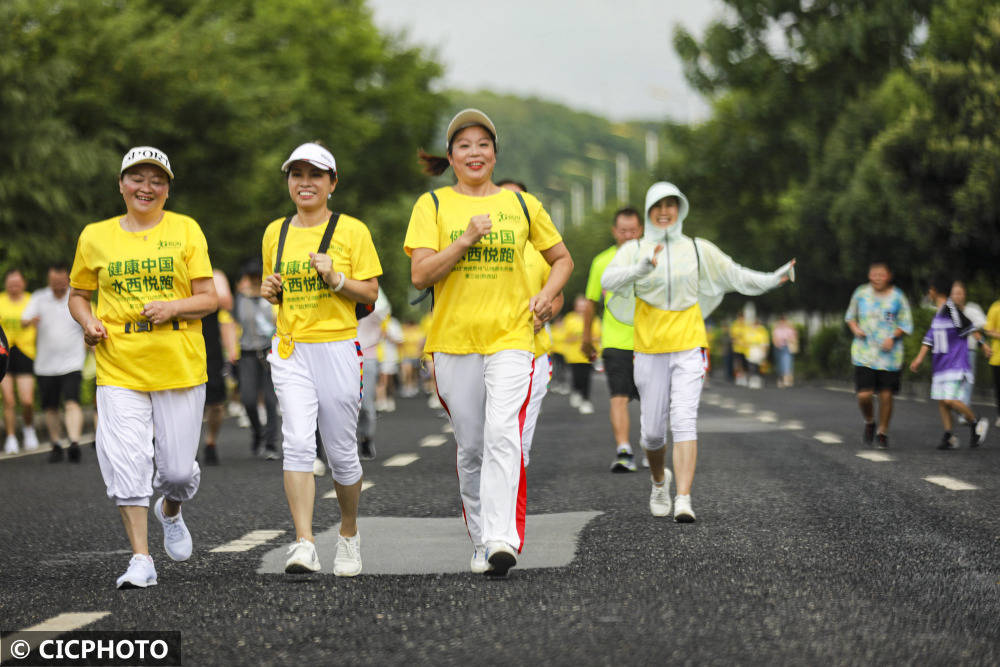 ↑2022年8月6日,人们在贵州省黔西市文峰街道花都大道参加徒步健身活动。CICPHOTO/周训超 摄