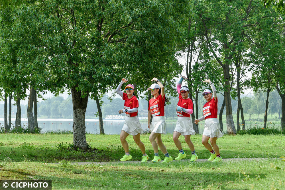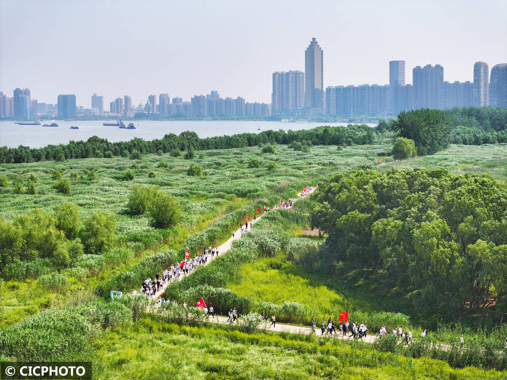 ↑2025年5月25日,安徽省铜陵市职工在西湖城市湿地公园参加徒步活动。CICPHOTO/储著传 摄
