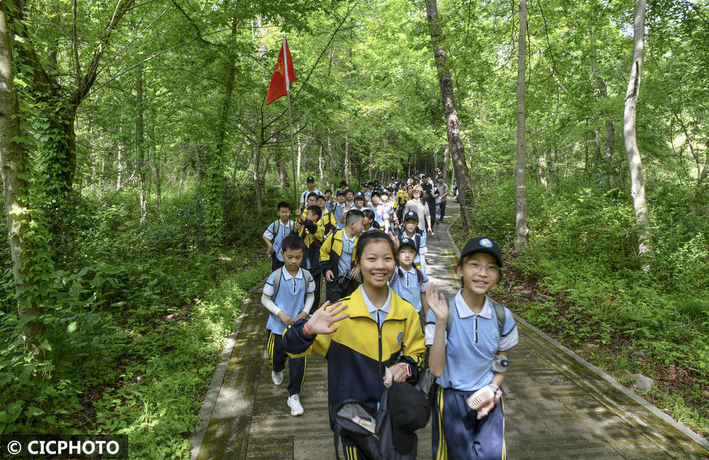 ↑2025年4月18日,浙江省台州市仙居县第七小学五年级师生在该县南峰街道石壁村绿道参加徒步活动。CICPHOTO/陈月明 摄