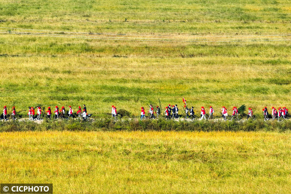 ↑2022年10月13日,湖北省孝感市云梦县第一中学的师生徒步行走在田间小道上。(无人机照片)CICPHOTO/胡学军 摄