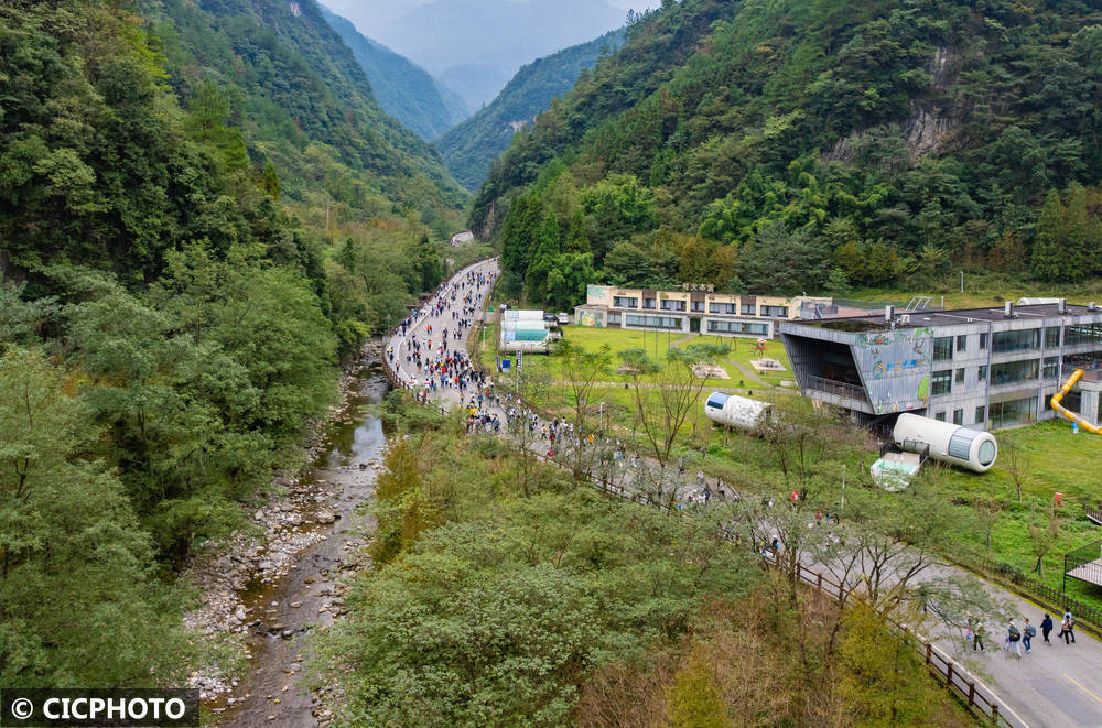 ↑2022年8月20日,健身爱好者在河北省邢台市临城县绿岭核桃小镇参加健步走活动。(无人机照片)CICPHOTO/刘一鸣 摄