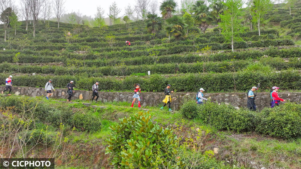 ↑2025年4月12日,健身爱好者在安徽省安庆市岳西县菖蒲镇徒步穿越一处茶园。(无人机照片)CICPHOTO/王先国 摄