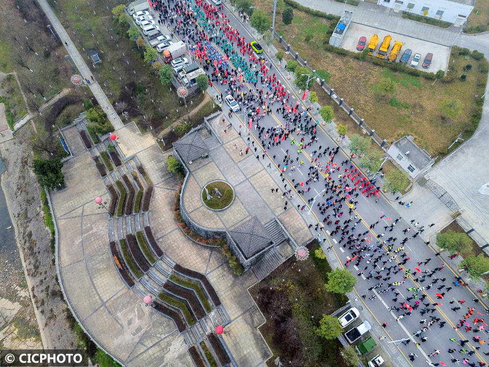 ↑2024年12月31日,湖北省恩施土家族苗族自治州利川市职工在参加徒步迎新年活动。(无人机照片)CICPHOTO/张光陆 摄