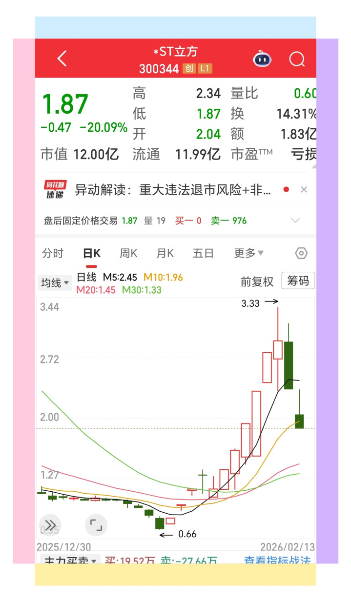 对于持有*ST立方股票的投资者而言,目前已进入最后的“逃生窗口”。根据规则,公司股票将在2月24日起停牌,后续若退市,将转入全国中小企业股份转让系统进行挂牌转让,流动性将大幅降低,投资者的损失也将进一步扩大。